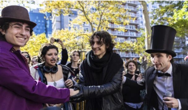 "I was walking through downtown Manhattan when I spotted a flyer for a Timothée Chalamet Lookalike Contest. Naturally, I added it to my calendar — it felt like civic duty. It happened to be the day after my birthday, so I dragged my friends along to celebrate. Somehow, I knew Sir Wonka himself would show up. And he did.